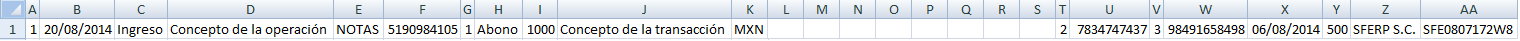 Este ejemplo muestra una transacción que contiene información de una transferencia, como podrá notar los campos del cheque y CFDI se encuentran vacíos.