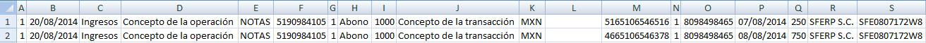 El siguiente ejemplo contiene datos de 2 cheques, recuerde que puede incluir información de "N" cheques por lo que cada uno de ellos representará una fila. Así mismo los campos de la transferencia y CFDI se encuentran vacíos.