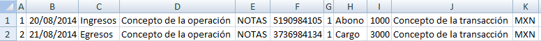Nótese que el siguiente ejemplo contiene 6 filas las cuales corresponden a 2 pólizas con una transacción; sin datos de cheques/transferencias/CFDI (campos vacíos).