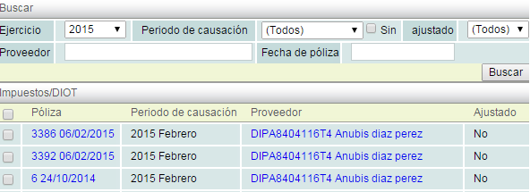 Puede buscar estas pólizas por: "Ejercicio", "Periodo de causación", "Ajustado", "Proveedor" y por "Fecha de póliza".