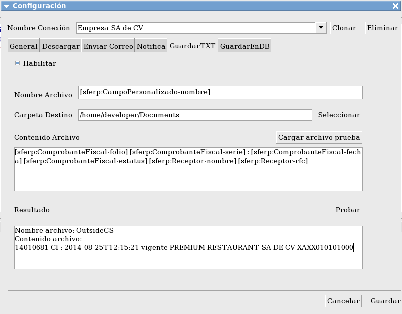 Para probar la configuración presione el botón de guardar y después seleccione el botón de "Probar", el sistema le mostrará el resultado de su configuración:
