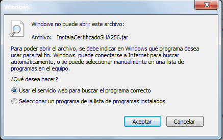 "C:\Program Files (x86)\Java\jre1.8.0_60\bin\java" -jar -Dhttps.proxyHost=Host name o Ip -Dhttps.proxyPort=Puerto InstalaCertificadoSHA256.jar -console