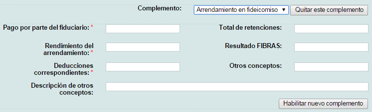 A continuación le mostrará el formulario donde ingresar los datos del complemento, los campos marcados con "*" (asterisco) son obligatorios