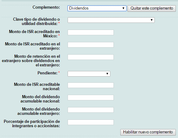 A continuación le mostrará el formulario donde ingresar los datos del complemento, los campos marcados con "*" (asterisco) son obligatorios.