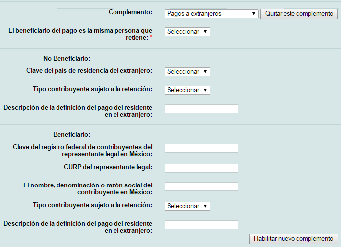 A continuación le mostrará el formulario donde ingresar los datos del complemento, los campos marcados con "*" (asterisco) son obligatorios.