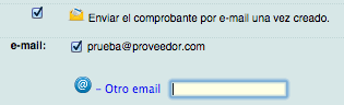 También puede realizar el envío automático de su comprobante una vez creado, si cuando realizó el registro de su proveedor agregó una cuenta de correo, seleccione la casilla de envíos "Enviar el comprobante POR e-mail una vez creado", así mismo puede agregar más cuentas de correos seleccionando el botón "Otro email".