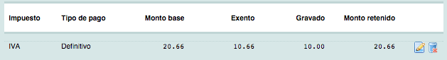 Al dar click en el botón "Agregar retención" la información se visualizará en la parte baja de la pantalla; si desea agregar más impuestos siga el proceso antes descrito.