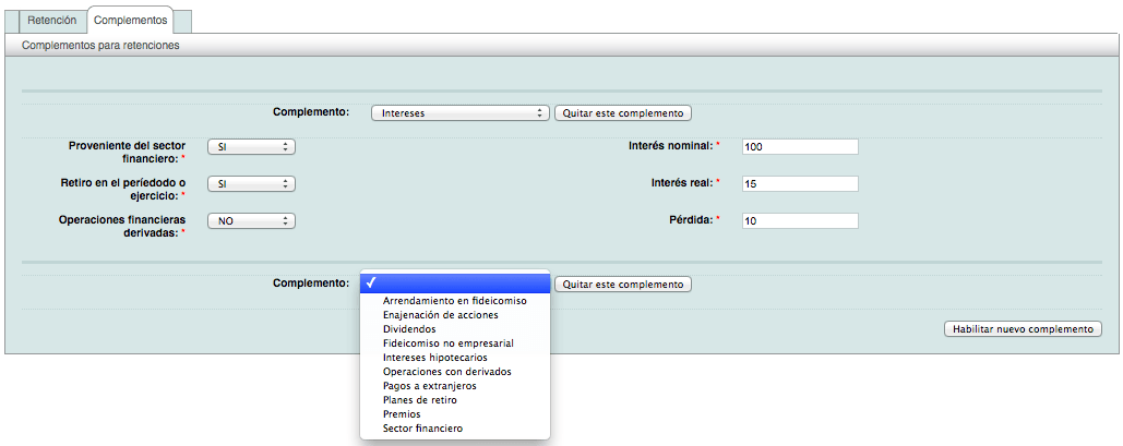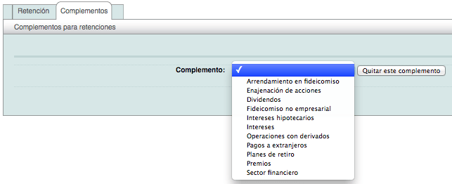 Una vez agregados los datos del o los complementos, diríjase nuevamente a la pestaña "Retención" para terminar el proceso y guardar el comprobante.