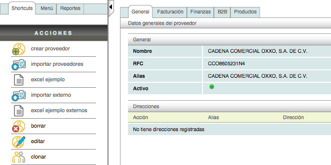 Para editar o agregar información a un proveedor previamente registrado, primeramente debe seleccionarlo para que se despliegue el resumen del mismo en su pantalla. A continuación dé click en la opción "Editar" ubicada en el menú "Acciones".