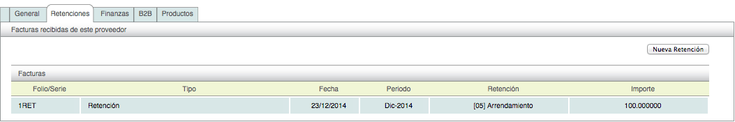 La pestaña retenciones le permite visualizar de una forma rápida aquellos CFDI de retenciones y pre-retenciones que están registrados a nombre del proveedor seleccionado, así mismo, puede generar un CFDI de retenciones directamente desde esta sección dando click sobre el botón "Nueva Retención".