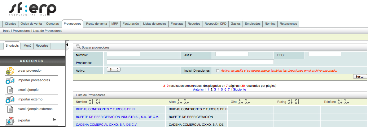 El sistema también le permite eliminar proveedores previamente registrados, dentro del menú "Acciones" encontrará el botón "Borrar".