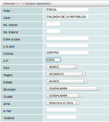 Datos solicitados: Alias (título de la dirección ingresada, esto le ayuda a identificar las diferentes sucursales que pueda tener su proveedor), calle y número, país, estado, ciudad, C.P, etc. Las ciudades, regiones y municipios están precargados en el sistema de acuerdo a la lista publicada por el INEGI.