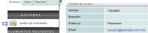 También puede realizar el cambio de su contraseña dentro del sistema, para realizar esta acción dé click en el nombre de usuario ubicado en la parte superior derecha de la pantalla principal, a continuación el menú "Acciones" le presentará la opción "Cambio de contraseña".