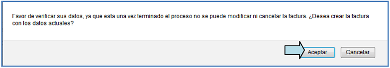 Dado que nuestro sistema trabaja en sincronía con el SAT es importante que toda la información que usted proporcione sea verídica y cerciore que el total de su factura coincida con el total del comprobante que le proporcionaron, para asegurar esto, debe confirmar la creación de la factura dando click en el botón "Aceptar".