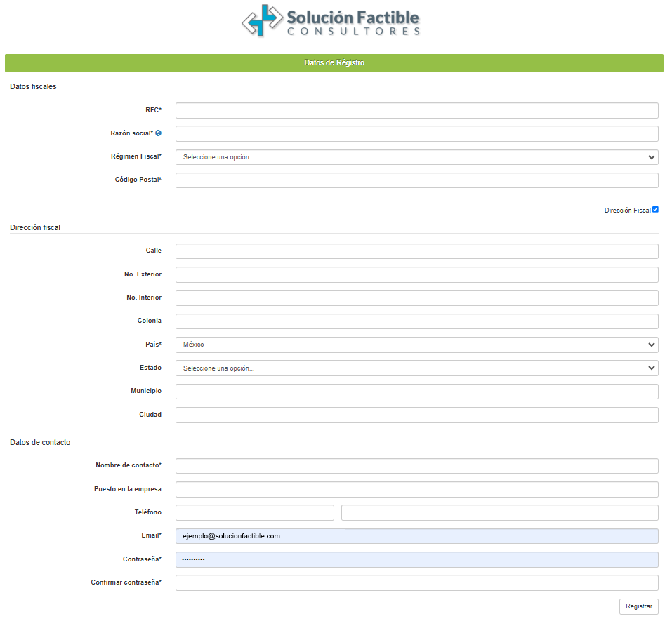 A continuación deberá proporcionar sus datos fiscales como se muestra en la siguiente imagen, los campos marcados con "*" (asterisco) son obligatorios.