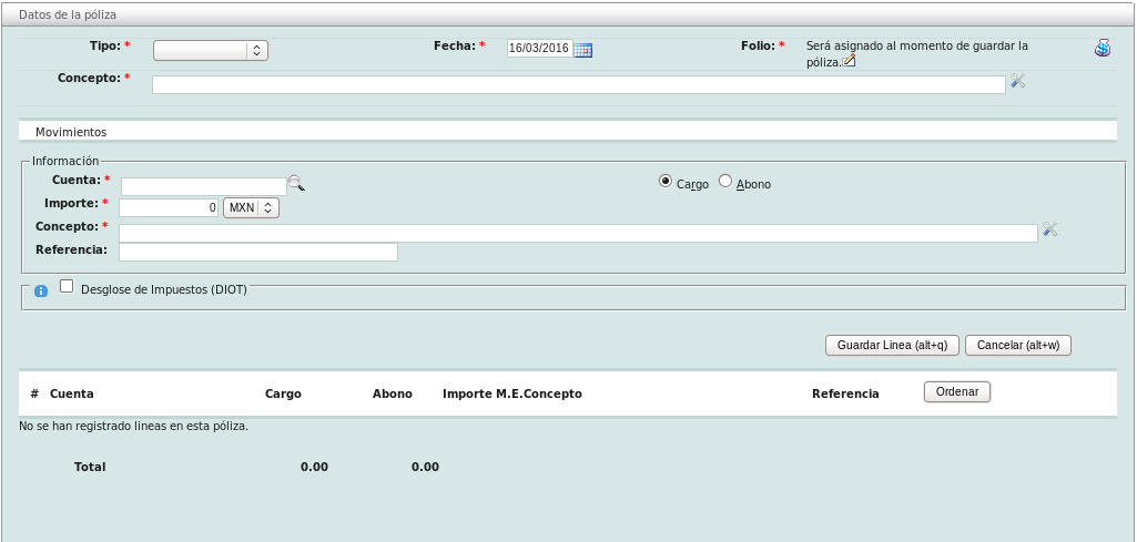 Al finalizar dé click en el botón "Guardar linea" para agregar el movimiento a su póliza; si desea agregar mas movimientos siga el proceso antes descrito.