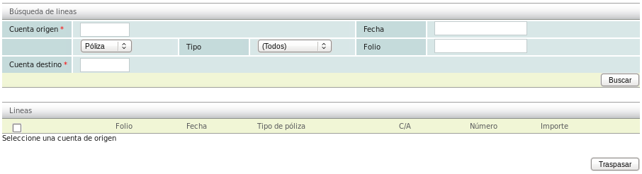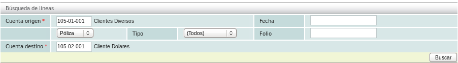 Ingrese la "Cuenta origen" y "Cuenta destino" de las pólizas a traspasar, una vez seleccionados estos valores dé click en el botón "Buscar".