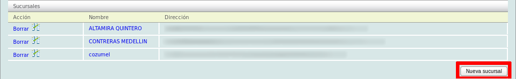 Podrá observar la dirección fiscal de su empresa, debajo encontrará las sucursales registradas, para agregar una nueva sucursal, de click en el botón "Nueva sucursal" ubicado en la parte inferior derecha de la página.