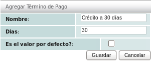 You will need to specify the "Nombre" and the number of "Días" for the new payment term. If you select the "Es el valor por defecto?" checkbox, this new term will become the new default value, as only one default term is allowed.