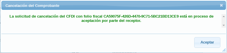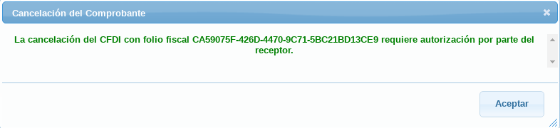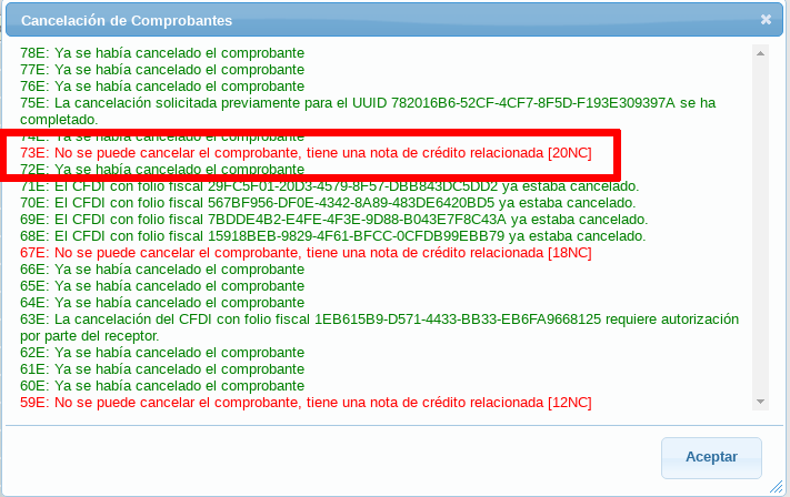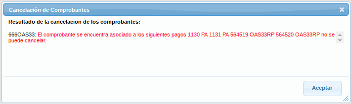 Si después usted intenta volver a cancelar el comprobante, se mostrará este mensaje.