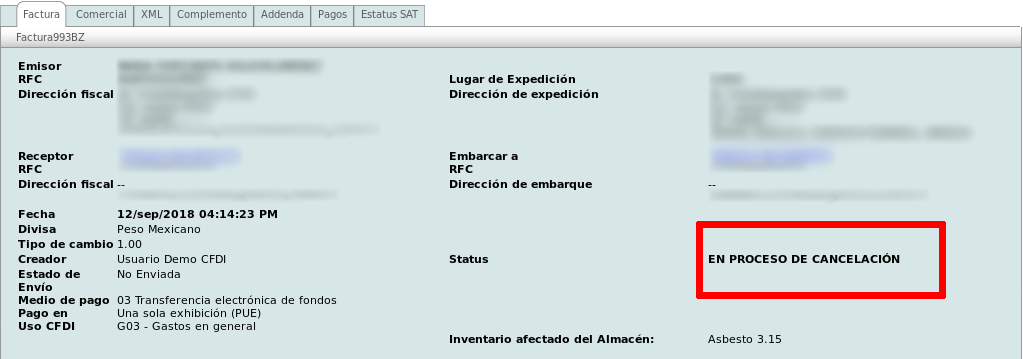 Se actualizará en la página y podrá ver que el Status del comprobante es ahora: EN PROCESO DE CANCELACIÓN