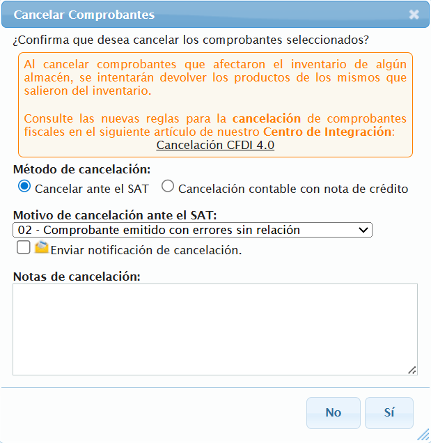 Se mostrará un menú donde podrá especificar un motivo de cancelación si lo desea. De click en el botón "Sí" para cancelar el comprobante.