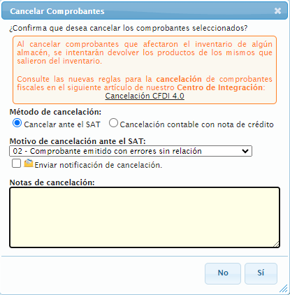 Finally, you can include cancellation notes, which will be stored in Solución Factible and will not be shared with the SAT (Mexican Tax Administration Service).