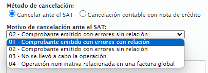 A menu will be displayed where you will need to specify the reason for cancellation to the SAT (Mexican Tax Administration Service).