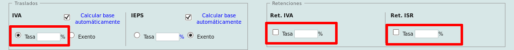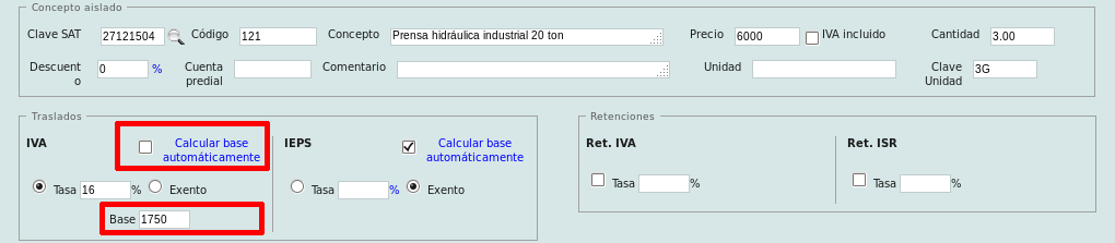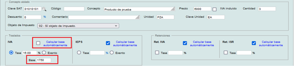 Si usted necesita calcular una base distinta solamente necesita desactivar la opción "Calcular base automáticamente" al lado de cada impuesto y especificar la nueva base, esta puede contener hasta 6 números decimales de acuerdo con la guía de llenado del SAT.
