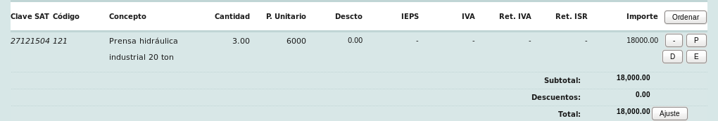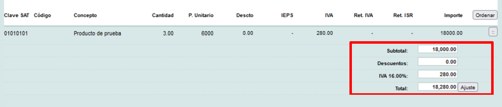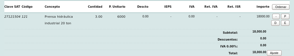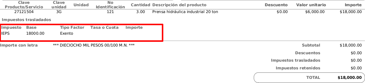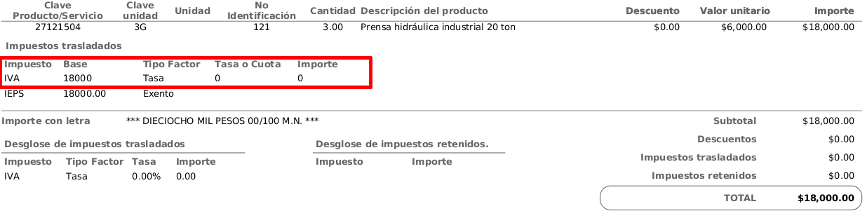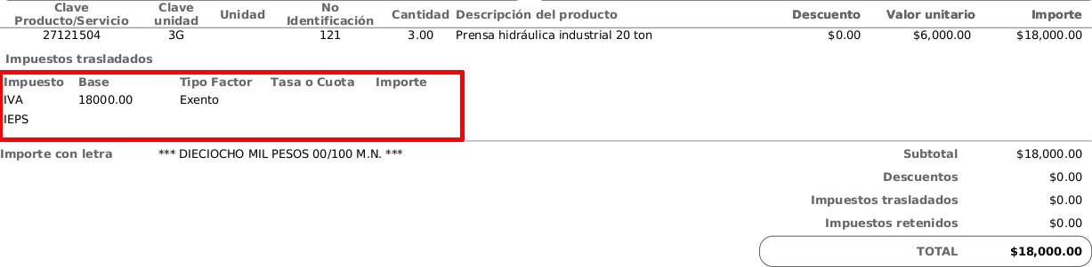 Por consecuencia no se mostrará ningún monto por impuesto. En este ejemplo el IVA e IEPS son exentos, por lo que no figuran.