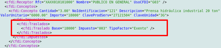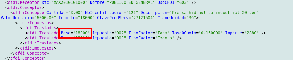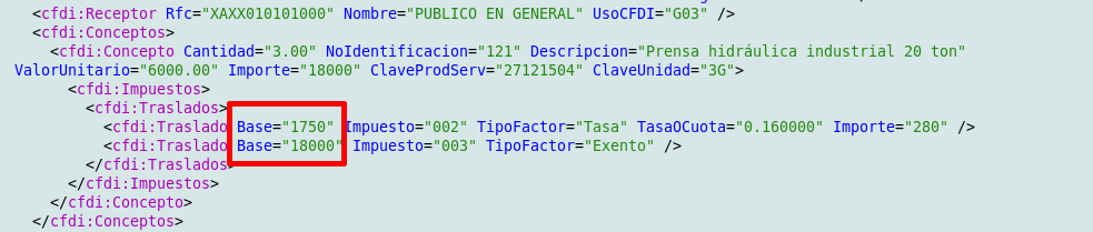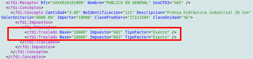 Esto se puede constatar al ver la linea del impuesto con base manual de cada concepto dentro del XML. El impuesto del IEPS, aunque es exento para esta factura, se calcula en el sistema de manera automática, ya que esta opción estaba activada.