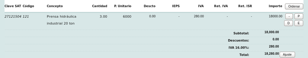 En este ejemplo el sistema multiplica el precio 6000.00 X la cantidad 3.00 dando como base 18000. Al aplicar el impuesto de 16% a la base tenemos: 0.16 X 18000.00 dando el impuesto de IVA por 2880.00.