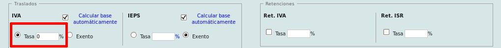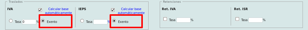 Por consecuencia no se mostrará ningún monto por impuesto. En este ejemplo el IVA, Ret. IVA y Ret. ISR no tienen valor y no se toman en cuenta. Solo queda el IEPS de traslado como exento.