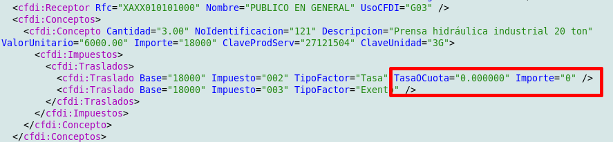 Esto se puede constatar al ver la linea del impuesto de cada concepto dentro del XML. Viendo que sí esta presente el impuesto.