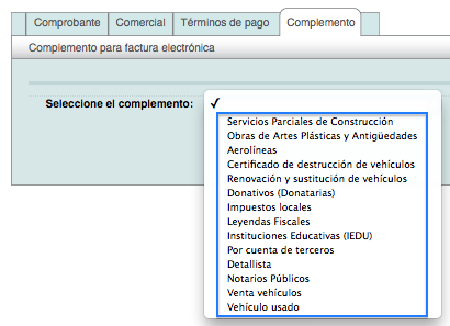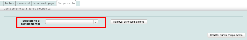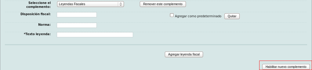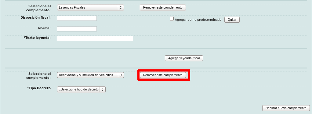 Clicking will open the form for you to enter the information of the selected plugin, if you want to add another complement click on the button "Habilitar nuevo complemento" and follow the process described above.