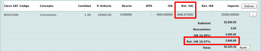 Debajo se mostrará el resumen de productos/servicios y los totales del CFDI, notará que el apartado "Ret. IVA" y/o "Ret. ISR" presenta el valor agregado.