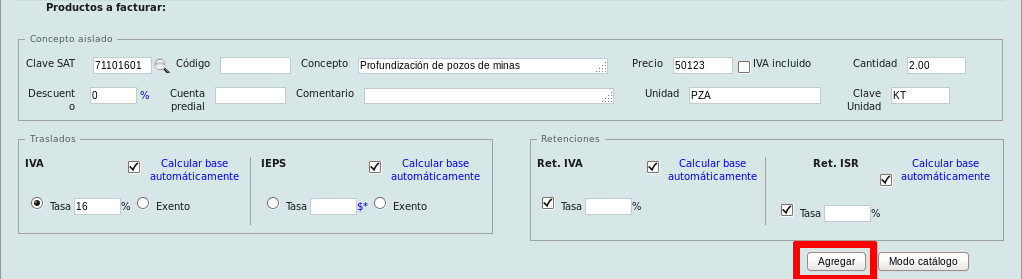 Necesita como mínimo especificar el producto/servicio, su código, precio, cantidad, unidad y clave de unidad para poder agregarlo.