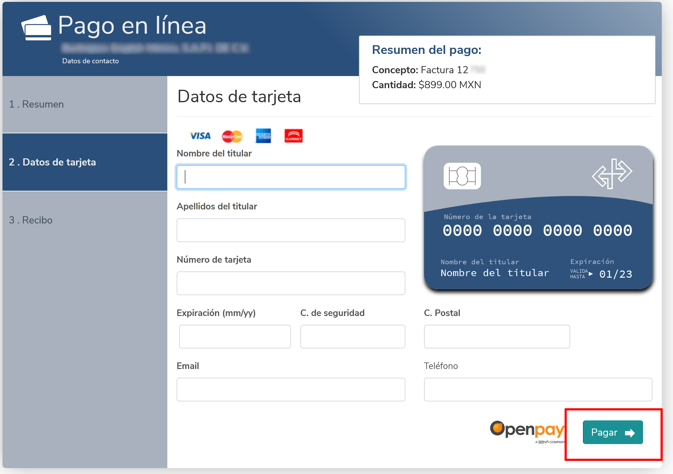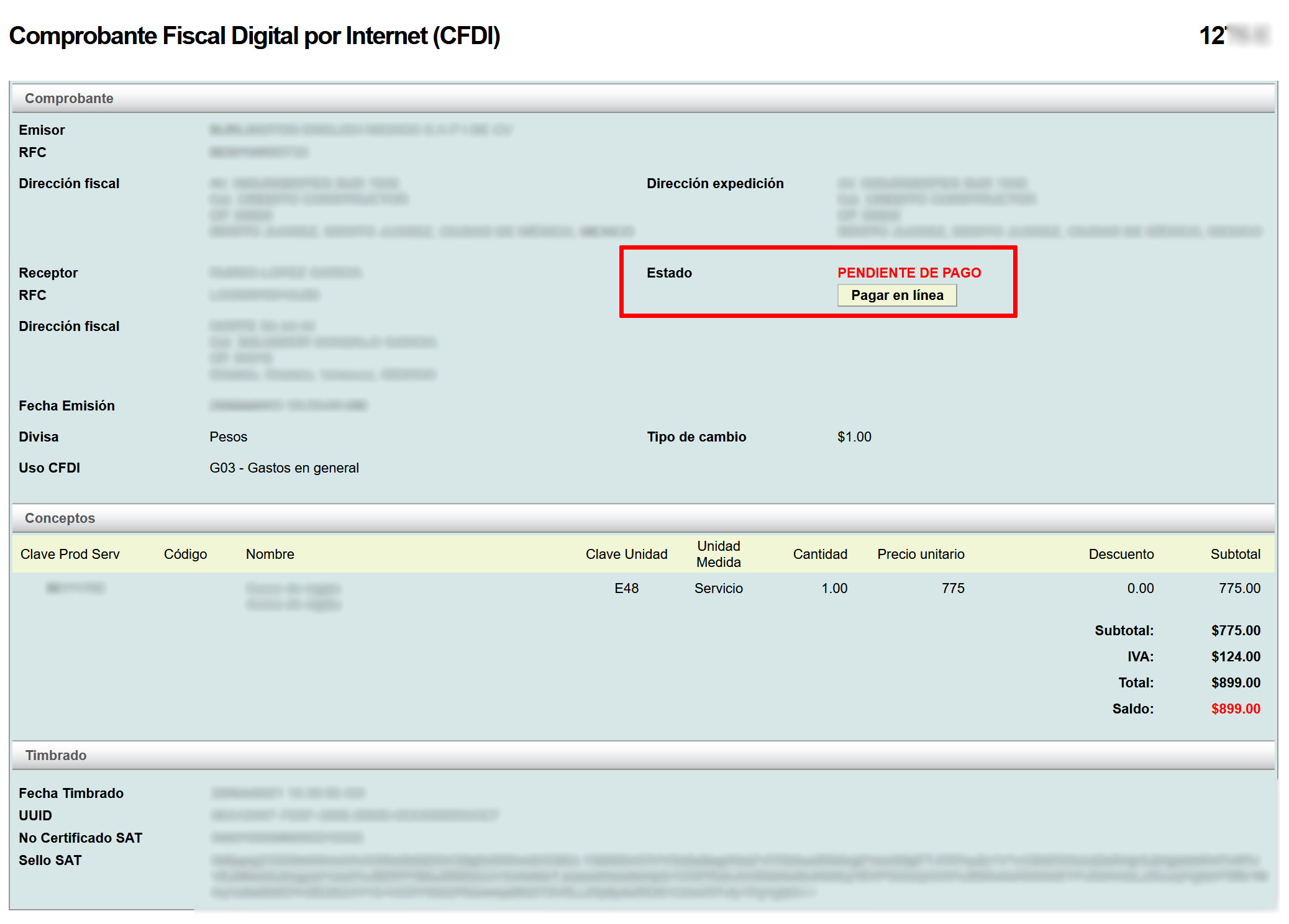 Next, your default browser will open the following window with the invoice information. Click on the "Pagar en línea" button.
