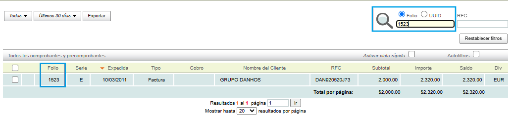 Folio: this option allows you to search for a receipt by entering the desired folio or series. Once you enter the information, press the "Enter" key on your keyboard and the system will perform the search.