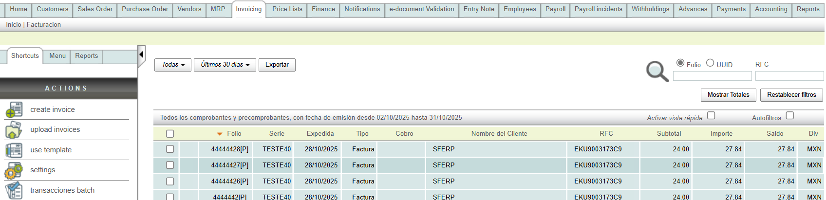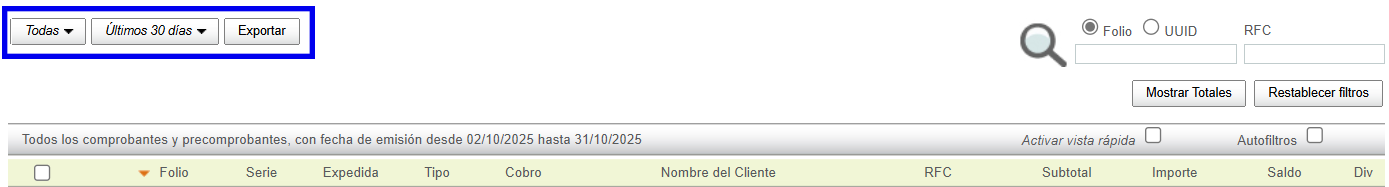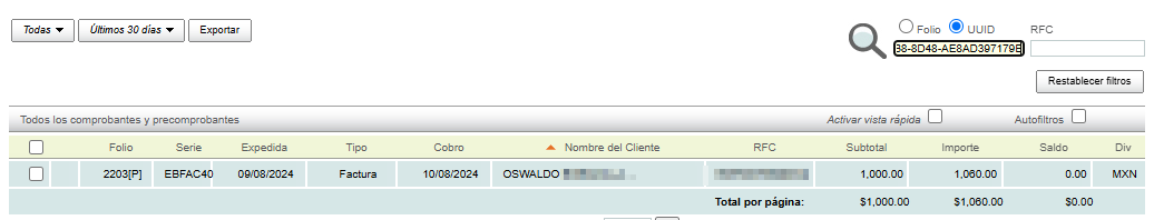 Note: You can perform a search by combining any of the filters (Folio, Serie o RFC).