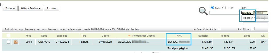 RFC: this option allows you to examine a customer's receipt by entering the RFC. Once you enter the information, press the "Enter" key on your keyboard and the system will perform the search.