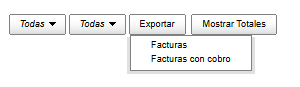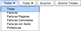 In the first filter you can view the receipts by status (Facturas, Facturas pagadas, Facturas canceladas, Facturas con saldo, Prefacturas).
