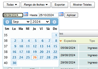 If you select the "Rango de fechas" option, two fields will appear where you must select the start and end dates. Once you have selected the range, click "Aplicar" to display the required information.