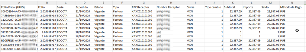 A file will be generated with the following fields: Tax ID (UUID), Issued, Type, Tax ID, Client, Currency, Subtotal, Total Amount, and Balance. This list is easier to edit and manipulate using your preferred spreadsheet program.