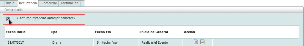 Go to the "Recurrencia" section and select the option "¿Facturar instancias automáticamente?".