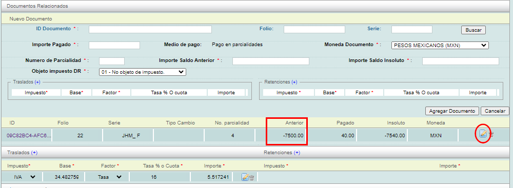 Después, edite cada factura agregada y en el campo “Saldo Anterior” modifique el monto al valor inicial como si fuera el primer pago, ya que el sistema considera todavía el pago anterior como vigente.