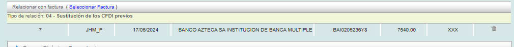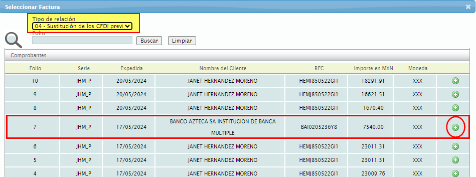 En la nueva ventana que se habilita debe indicar el “Tipo de relación” 04 - Sustitución de los CFDI previos” y posteriormente, busque el comprobante y sobre este de click en el círculo verde para añadirlo al pago actual. Ahora ya puede cerrar esta ventana.