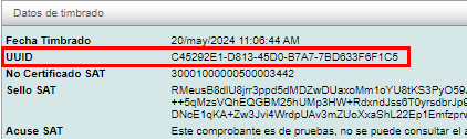Finalice esta primera parte presionando el botón "Guardar". Con este nuevo comprobante, diríjase al final y localice la sección "Datos de Timbrado", copie el UUID generado por el SAT.