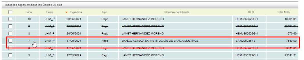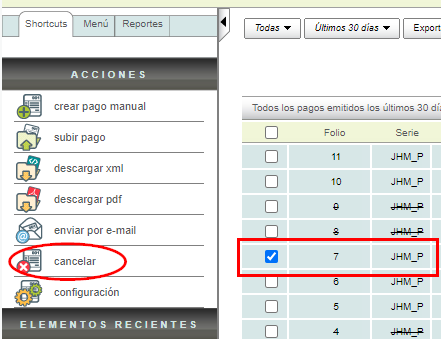 Posteriormente, regrese al comprobante que desea cancelar y para seleciconarlo, de click en la opción "Cancelar", localizada en el menú de acciones del lado izquierdo.