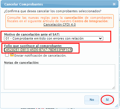 Aparecerá una ventana activa, en la que seleccionará la cancelación ante el SAT con la clave “01 - Comprobante emitido con errores, con relación”. y en el campo Folio que sustituye pegue el UUID copiado anteriormente.